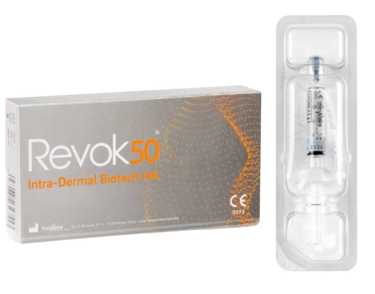 50mg. of 2,200kDa hyaluronic acid. and amino acids (L-proline, L-hydroxyproline, glycine and L-lysine HCI) per syringe make Revok50 ® a next-generation skin booster.